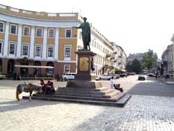 Памятник основателю Одессы А.Э. Ришелье, венчающий известную Потемкинскую лестницу, 400 ступенек которой ведут к Одесскому морскому порту. Герцог с приветствием протягивает приезжающим руку и представляет на их суд город, проживший не одно столетие и видевший многие моменты истории.